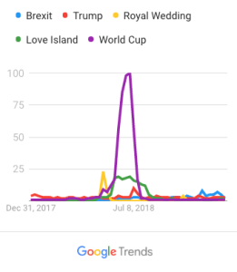 Wow. We really got into Love Island this summer. A longer lasting spike, a much bigger average score than all the others. Finally, let’s blow all the rest away and add in the 2018 World Cup: